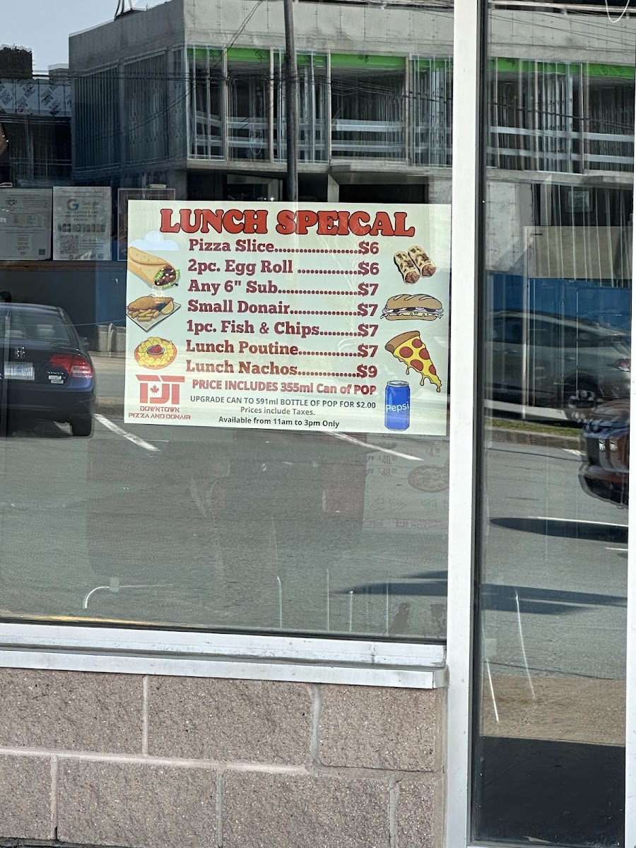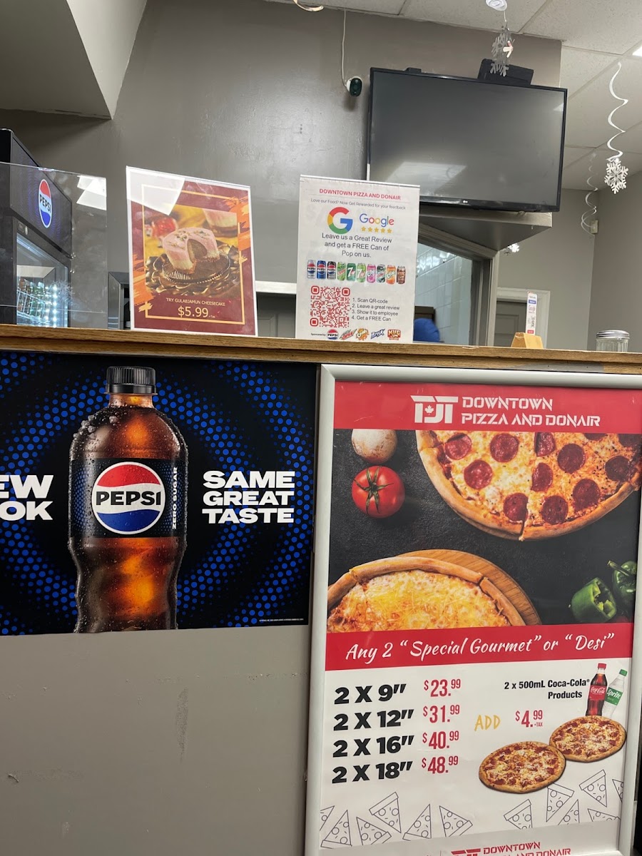 Beyond pizza and donairs, the restaurant rounds things out with hearty SANDWICHES like Classic Clubhouse Sandwich, Hot Chicken Sandwich, and Hot Hamburger Sandwich, as well as filling BURGER options such as Hamburger, Hamburger with Fries, Cheeseburger with Fries, Bacon Cheeseburger with Fries, and Chicken Burger with Fries. APPETIZERS like Downtown Box, Nachos Supreme, Potato Skins 9", Potato Skins 12", and Mozza Sticks 6pc make great starters, while Chicken Quesadilla, Spicy Chicken Quesadilla, and Steak Quesadilla add variety. Finally, the SEA FOOD section-1pc Fish & Chips, 2pc Fish & Chips, and 3pc Fish & Chips-offers comforting classics, neatly rounding out a menu that feels diverse, generous, and thoughtfully designed.