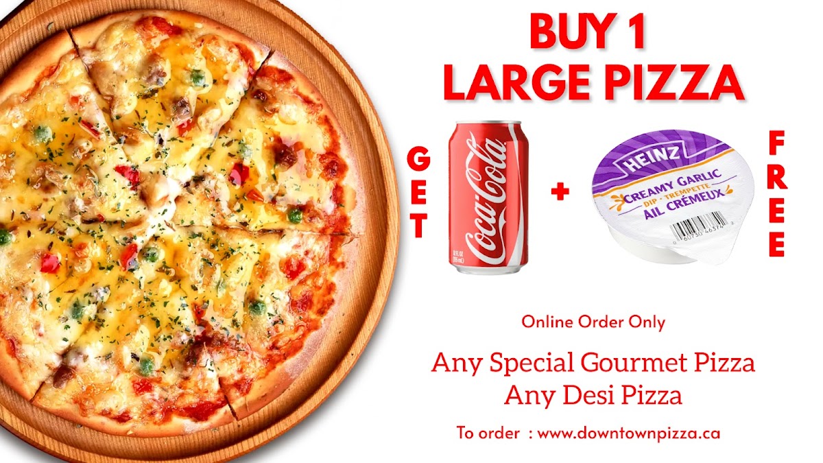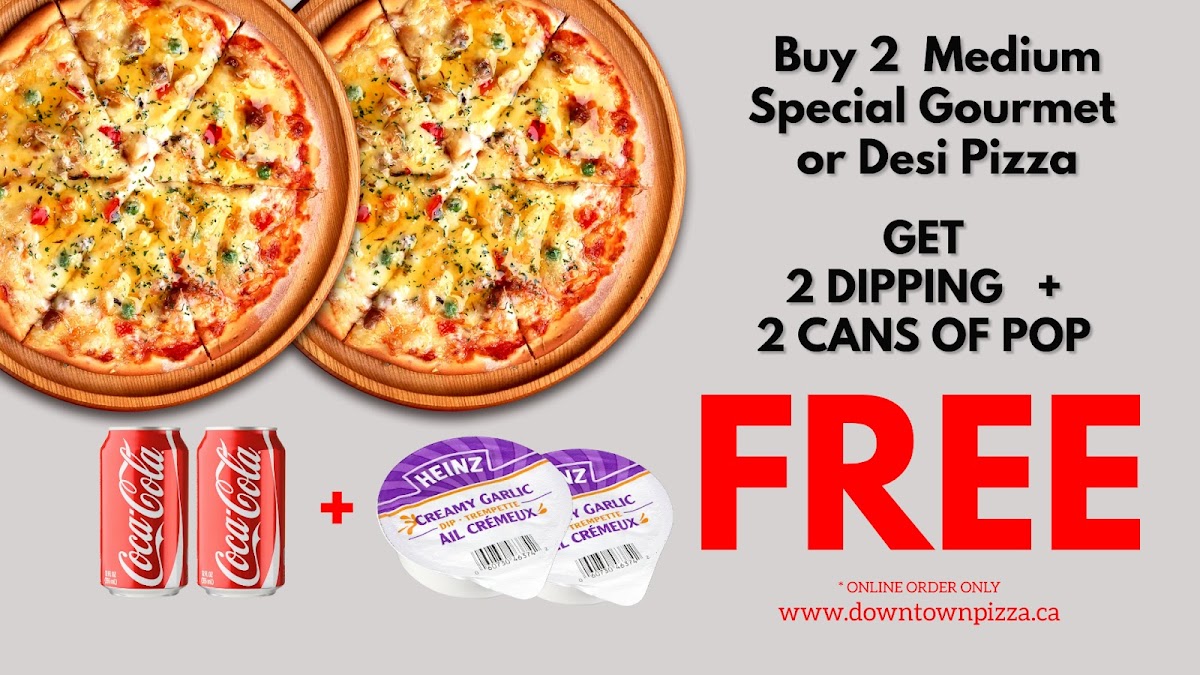 Comes with Large-16” Desi Pizza, Medium Garlic Fingers, 2ltr Bottle of Pop, and 4 Dipping sauce of your choice